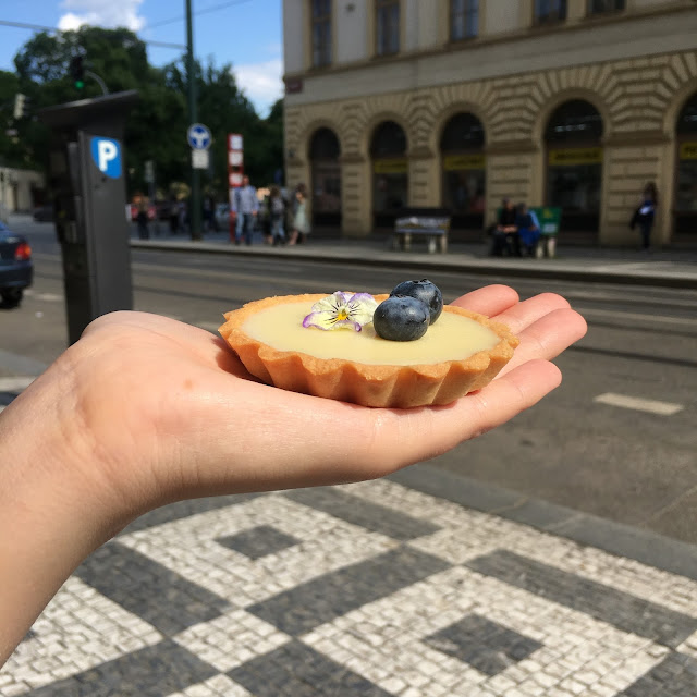 Když jsme dostali obě naše kávy, můj pohled se na chvíli zastavil u vitrínky s dezerty, ve které se na mě usmíval košíček ozdobený borůvkami a květem fialky. “Hele.” Ukázala jsem na něj. Dostalo se mi úsměvu a žádného slova. No a za několik vteřin jsem ho měla v ruce. Ještě teď, když si na něj vzpomenu si pamatuji jemnou chuť bílé čokolády, křehkost lineckého těsta a příjemné osvěžení borůvek nakonec.